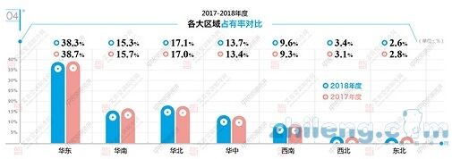 時(shí)至2018年度,艾肯空調(diào)制冷網(wǎng)通過(guò)連續(xù)幾年的監(jiān)測(cè),基本可以確定的是,主流品牌的市場(chǎng)集中度一直在加強(qiáng),且品牌格局有固化的趨勢(shì)。比如處于第一陣營(yíng)中的100億元以上的企業(yè)大金、海信日立、美的、格力,目前為止尚看不出有其他哪個(gè)品牌可以超越。這四個(gè)品牌在2018年度的表現(xiàn)基本是家裝零售市場(chǎng)面臨挑戰(zhàn),但工程項(xiàng)目市場(chǎng)尤其是房地產(chǎn)樓盤(pán)配套獲得了相對(duì)不錯(cuò)的增長(zhǎng)。其中,海信日立公司海信品牌的增長(zhǎng)最為突出。 在第二陣營(yíng)品牌中,海爾中央空調(diào)在磁懸浮離心機(jī)、更新機(jī)以及多聯(lián)機(jī)等產(chǎn)品市場(chǎng)增長(zhǎng)明顯,且卡薩帝品牌也為其提供了更多的助力,因此海爾中央空調(diào)的出貨額在2018年度再創(chuàng)新高,其增長(zhǎng)率也遠(yuǎn)高于行業(yè)平均增幅。東芝憑借在精裝修樓盤(pán)配套市場(chǎng)的優(yōu)異成績(jī),在2018年度獲得了較好的增長(zhǎng),其銷(xiāo)售規(guī)模也達(dá)到了50億元級(jí)別,且市場(chǎng)占有率進(jìn)一步提升,繼續(xù)鞏固其在日系多聯(lián)機(jī)品牌前三甲的位置。麥克維爾則繼續(xù)穩(wěn)扎穩(wěn)打,在2018年度實(shí)現(xiàn)了穩(wěn)定的增長(zhǎng)。在江森自控約克品牌將多聯(lián)機(jī)業(yè)務(wù)交由海信日立公司銷(xiāo)售之后,事實(shí)上,在2018年度麥克維爾已經(jīng)在市場(chǎng)總量上實(shí)現(xiàn)了對(duì)約克品牌的超越。 其它美系品牌中,約克品牌盡管不再銷(xiāo)售多聯(lián)機(jī)產(chǎn)品,但其渠道業(yè)務(wù)和兩聯(lián)供產(chǎn)品仍然獲得了不錯(cuò)的增長(zhǎng);特靈則以更加靈活的政策在2018年度取得了美系品牌中最高的增長(zhǎng)率,其離心機(jī)產(chǎn)品和兩聯(lián)供產(chǎn)品表現(xiàn)搶眼;開(kāi)利則繼續(xù)加強(qiáng)了對(duì)離心機(jī)以及輕商產(chǎn)品的銷(xiāo)售;頓漢布什則在細(xì)分市場(chǎng)如軌道交通等行業(yè)繼續(xù)保持領(lǐng)先優(yōu)勢(shì)。 值得一提的是天加,在整體市場(chǎng)不利的情況下,天加實(shí)現(xiàn)了超過(guò)20%的增長(zhǎng),其銷(xiāo)售規(guī)模也順利超過(guò)開(kāi)利。2018年度,天加繼續(xù)在末端及凈化領(lǐng)域保持領(lǐng)先優(yōu)勢(shì),與此同時(shí),多聯(lián)機(jī)業(yè)務(wù)成為天加新的增長(zhǎng)點(diǎn)。 其它主營(yíng)多聯(lián)機(jī)產(chǎn)品的品牌中,三菱重工海爾、三菱重工、三星、松下等日韓系品牌,和志高、奧克斯等國(guó)產(chǎn)品牌都取得了一定的增長(zhǎng)。冷水機(jī)組品牌中,荏原在溴化鋰和離心機(jī)兩個(gè)產(chǎn)品領(lǐng)域都取得了不錯(cuò)的業(yè)績(jī),EK、江森自控日立萬(wàn)寶空調(diào)、申菱、國(guó)祥、克萊門(mén)特等品牌也在各自擅長(zhǎng)的領(lǐng)域中有較好的表現(xiàn)。 在區(qū)域?qū)用妫ㄟ^(guò)對(duì)比2017-2018年度各大區(qū)域的占有率可以看出,受家裝零售市場(chǎng)影響,華東區(qū)域的占有率略有下滑,受整體大環(huán)境影響占有率同比下滑的區(qū)域還有華南區(qū)域和東北區(qū)域,華北區(qū)域變化不大,而華中、西南、西北所代表的中西部地區(qū)由于仍有增長(zhǎng)潛力和產(chǎn)業(yè)轉(zhuǎn)移等因素,在2018年度的占有率繼續(xù)保持提升,與其它下滑的區(qū)域形成鮮明的對(duì)比。(見(jiàn)圖4)