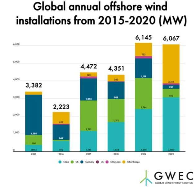 據(jù)全球風(fēng)能理事會(huì)GWEC(Globle Wind Energy,GWEC)最新報(bào)告,2020年,全球新增海上風(fēng)電裝機(jī)容量的一半來自中國。 絲路中心(BRICC)觀察到,海上風(fēng)電已是全球能源投資的熱點(diǎn)產(chǎn)業(yè)。目前海上風(fēng)電發(fā)展目前是什么態(tài)勢(shì)?全球資源情況如何?今后將如何發(fā)展?我們應(yīng)該采取什么策略? 本篇文章,絲路中心(BRICC)根據(jù)公開資料對(duì)以上問題進(jìn)行分析,并提出相應(yīng)的工作建議。 文章要點(diǎn) •全球海上風(fēng)電發(fā)展呈現(xiàn)進(jìn)入爆發(fā)期。后續(xù)還會(huì)有越來越多的國家出臺(tái)支持政策,發(fā)展還將加快。中國連續(xù)三年海上風(fēng)電新增裝機(jī)量處于世界領(lǐng)先地位,2020年新增海上風(fēng)電裝機(jī)量超過3GW,占全球增量一半以上。 •中國近年已經(jīng)成為全球海上風(fēng)電發(fā)展的領(lǐng)頭羊,今后還將繼續(xù)加大力度。歐洲國家,韓國、越南等亞洲國家也在持續(xù)發(fā)力。 •全球海上風(fēng)電具有巨大的發(fā)展空間。隨著單機(jī)容量不斷增大、制造和安裝成本的持續(xù)下降,海上風(fēng)電將越來越具備商業(yè)競(jìng)爭價(jià)值。 •在一些海上風(fēng)電資源豐富的國家,在其政策將明未明之時(shí),及時(shí)搶占資源好的風(fēng)電場(chǎng)并連續(xù)開發(fā),是當(dāng)前海外電力投資的重要方向。 •未來提高競(jìng)爭力,海上風(fēng)電+儲(chǔ)能、海上風(fēng)電+制氫等模式,也是應(yīng)該考慮的可持續(xù)發(fā)展模式。 1 中國海上風(fēng)電行業(yè)進(jìn)入爆發(fā)期 根據(jù)全球風(fēng)能理事會(huì)(Global Wind Energy Council,GWEC)發(fā)布的最新數(shù)據(jù)顯示,2020年全球海上風(fēng)電新增裝機(jī)量超過6GW,盡管受到新冠疫情影響,但風(fēng)電發(fā)展在能源行業(yè)中保持良好勢(shì)頭,成為有史以來第二好的年份,詳見圖1、表1。 總體而言,目前全球海上風(fēng)電裝機(jī)總?cè)萘恳殉^35GW,在過去5年中增長了106%,詳見圖2、表2。