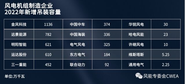 2022年,中國新增吊裝容量前五的風(fēng)電機組制造企業(yè)是金風(fēng)科技、遠景能源、明陽智能、運達股份、三一重能,其新增裝機容量分別為1136萬千瓦、782萬千瓦、621萬千瓦、610萬千瓦、452萬千瓦。