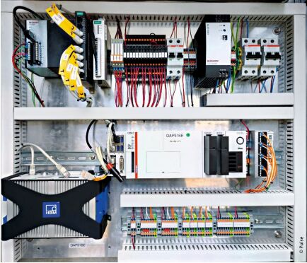 控制柜內(nèi)配備 CX2000 嵌入式控制器和直接插接的 ELM 系列測(cè)量端子模塊(圖片中心)、CU8130 UPS(左上)以及PS2000 電源(右上)