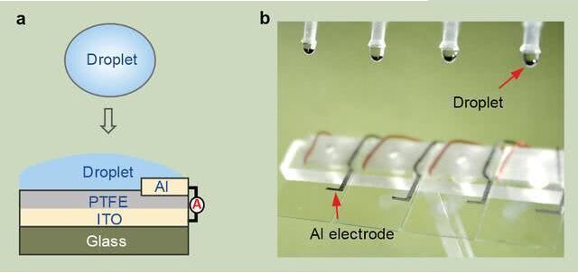 圖a是基于液滴的發電機(DEG)的示意圖。圖b是在玻璃基板上制造的四個平行的DEG器件的光學圖像。 香港城市大學/自然 圖