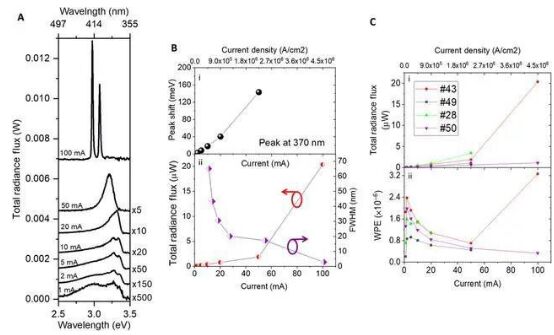 當在實驗中不斷加大電流時,研究小組又有了一個驚人發現。雖然 LED 起初在一定波長范圍內發光,但其最終會縮小為深紫色的兩個波長,他們的微型 LED 竟然變成了一個微小的激光器,實驗記錄到的電流密度為 1000 kA/cm 2,LED 轉換為激光,亮度超過 20 微瓦。 “將 LED 轉換成激光需要很大的努力。通常,需要將 LED 耦合到諧振腔,諧振腔才能使光線反彈以產生激光! 尼古巴赫說!暗捠皆O計可以獨立完成全部工作!蔽⑿图す馄鞯膽靡卜浅6,不僅在化學傳感方面,而且在下一代手持式通信產品、高清顯示器和消毒方面也是如此。 尼古巴赫認為:“這種全新 LED 設計作為重要的構建基塊具有很大的潛力! “雖然這不是人們制造的最小的激光器,但它是一個非常明亮的激光器,且不存在效率下降的問題,將會大有用處! 研究結論中指出,這項發現令人鼓舞,代表了 LED 設計體系結構的重要一步,可以克服 LED 中的 “電流密度下降” 和“溫度下降”效應,以最大化其每個像素可實現的輸出功率。