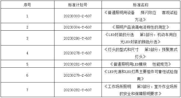 2023年3月21日,國(guó)家標(biāo)準(zhǔn)化管理委員會(huì)下達(dá)2023年第一批推薦性國(guó)家標(biāo)準(zhǔn)計(jì)劃及相關(guān)標(biāo)準(zhǔn)外文版計(jì)劃(國(guó)標(biāo)委發(fā)【2023】10號(hào)),其中包括全國(guó)照明電器標(biāo)準(zhǔn)化技術(shù)委員會(huì)歸口的7項(xiàng)照明領(lǐng)域國(guó)家標(biāo)準(zhǔn)項(xiàng)目。