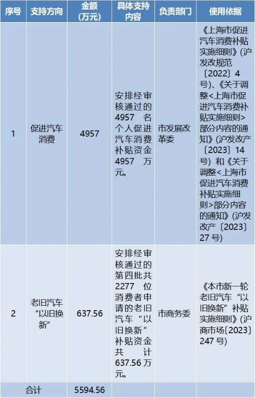 1、按照《上海市促進汽車消費補貼實施細則》(滬發改規范〔2022〕4號)、《關于調整<上海市促進汽車消費補貼實施細則>部分內容的通知》(滬發改產〔2023〕14號)和《關于調整<上海市促進汽車消費補貼實施細則>部分內容的通知》(滬發改產〔2023〕27號)規定,安排經審核通過的4957名個人促進汽車消費補貼資金共計4957萬元。