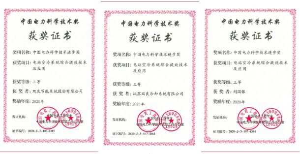 近日,雙良節能系統股份有限公司、江蘇雙良冷卻系統有限公司與西安熱工院等聯合申報的《電站空冷系統綜合提效技術及應用》項目榮獲2020年度中國電力科學技術進步獎三等獎。