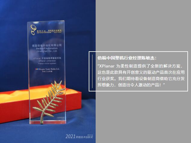 在備受業內關注的“2021 塑料行業 - 榮格技術創新獎”頒獎典禮上,倍福公司的 XPlanar 平面磁懸浮輸送系統以其革命性的創新技術和卓越的性能,征服了來自行業協會、科研院校的資深評委團,摘得“2021 年度塑料行業 - 榮格技術創新獎”。 2021 年 3 月 9 日,“2021 塑料行業 - 榮格技術創新獎”頒獎典禮在上海龍之夢大酒店隆重舉辦。來自塑料行業的近百位嘉賓,包括獲獎企業代表、協會領導、行業媒體等齊聚一堂,共同見證了創新企業如何通過技術創新、提高生產效率以及提升產品品質,推動塑料行業的進步和發展。