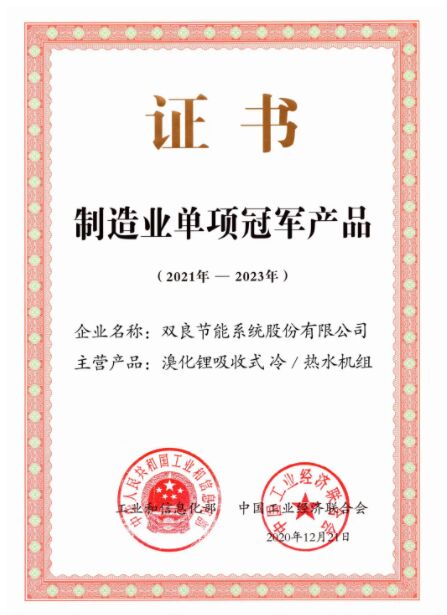 雙良溴化鋰吸收式冷/溫水機(jī)組,榮獲由工信部、中國工業(yè)經(jīng)濟(jì)聯(lián)合會(huì)共同頒發(fā)的“ 中國制造業(yè)單項(xiàng)冠軍產(chǎn)品 ”證書。