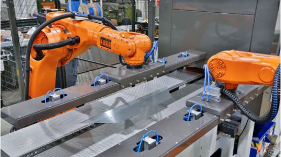 兩個庫卡關節型機器人與倍福基于 PC 的控制技術進行相結合,堆放剪切好的疊片。