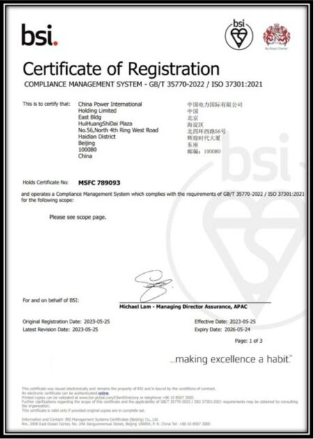 近日,中國(guó)電力國(guó)際有限公司(以下簡(jiǎn)稱"中電國(guó)際")順利通過BSI專家團(tuán)隊(duì)多輪嚴(yán)格審核,獲得BSI頒發(fā)的GB/T 35770-2022/ISO 37301:2021合規(guī)管理體系認(rèn)證證書。