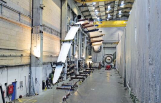 數百個應變片用于測量牽引工位(在背景)啟動的 100 米長的轉子葉片工作時產生的力和振動。