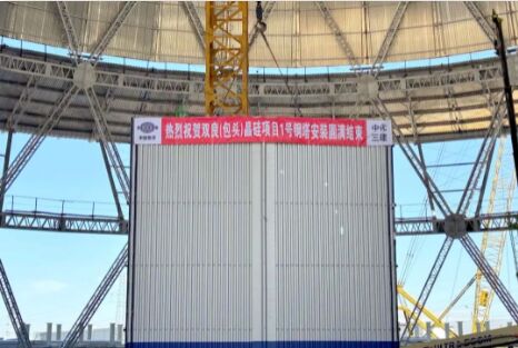 8月22日,在內蒙古包頭的雙良新能源光伏產業園三期50GW單晶硅項目(簡稱“三期項目”)建設現場,隨著頂部最后一塊蒙皮吊裝完成鋼塔合攏,三期項目1號、2號全鋼結構間冷塔順利封頂,為三期項目早日投產奠定了堅實的基礎。