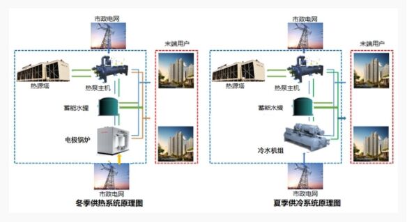 該項(xiàng)目中,能源中心的冷熱能供能范圍為北至環(huán)湖南一路,東至南港大道,南至環(huán)湖南二路,西至海港大道,總建筑面積約100萬平方米。項(xiàng)目地塊寸土寸金,屋面面積有限,周邊環(huán)境對噪音要求高,無法采用地(水)源熱泵、傳統(tǒng)空氣源熱泵等技術(shù)路線;燃?xì)鈨r格逐年遞增,燃?xì)忮仩t供熱成本太高;采用蓄能技術(shù),需要穩(wěn)定冷熱源。最終能源站采用多能互補(bǔ)的能源形式:熱源塔熱泵(離心熱泵系統(tǒng))+離心冷機(jī)+水蓄能+電鍋爐(備用),裝機(jī)熱負(fù)荷26MW,裝機(jī)冷負(fù)荷60MW。其中,熱源塔裝機(jī)熱負(fù)荷22MW,裝機(jī)冷負(fù)荷23.9MW。