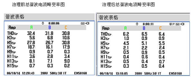 以下為西安某支行治理效果:ZAPF有源濾波器投入后,電流總畸變率從32.4%降低到6.2%,大大提高了電網的電能質量,濾波效果明顯。