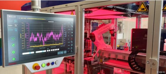 壓印是傳感器隔離膜片生產過程中一個不可或缺的的中間加工步驟,凱樂公司項目經理 Florian Wernli 解釋道:“我們的大部分壓力傳感器都封裝在充油不銹鋼外殼中。隔離膜片對于通過油將周圍介質的壓力傳輸至傳感器內的測量芯片中來說至關重要。”這就需要通過一臺性能強大的自動壓印機將隔離膜片壓印成特殊的形狀。凱樂公司開發與生產裝備部 Bruno Thalmann 補充道:“在經過泄漏檢測、用壓縮空氣清潔和熱平衡處理后,我們在同一工藝步驟中使用氫傳感器在高壓條件下進行壓印并進行確定性泄漏試驗。隨后使用圖像處理和人工智能進行誤差檢測。”壓印機的核心部分是一臺 KUKA 機器人,它用作拾放單元,將坯件送至加工位置,并將已完成的工件分成合格品(OK)和不合格品(NOK)兩個部分。