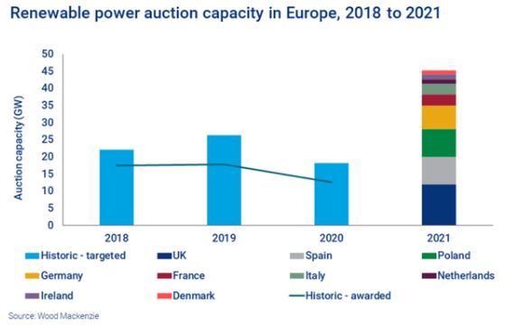 在經(jīng)歷了動蕩的2020年之后,歐洲電力市場有望迎來較為樂觀的2021年。在新的一年里,歐洲各國的政策制定者和市場參與者將在歐美綠色協(xié)議的指引下,向著零凈排放的目標(biāo)有效推動實質(zhì)性的進(jìn)程。預(yù)計2021年歐洲可再生能源競標(biāo)將創(chuàng)下新的記錄。 根據(jù)Wood Mackenzie最新的一項分析,2021年歐洲計劃競標(biāo)的總?cè)萘扛哌_(dá)45GW,其中包括17GW的風(fēng)電,6GW的光伏發(fā)電,以及技術(shù)中立的或多種可再生能源混合技術(shù)。 以往的競拍結(jié)果表明,中標(biāo)總量可能低于目標(biāo)值。在過去的三年里,歐洲競標(biāo)的平均成交率為70%,也就是說,2021年極有可能最終落地30GW的發(fā)電容量。