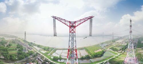 4月15日,這是導線展放后的昌古特高壓長江大跨越工程北岸跨越塔。當天,世界電壓等級最高的特高壓大跨越——昌古特高壓長江大跨越工程全線貫通。
